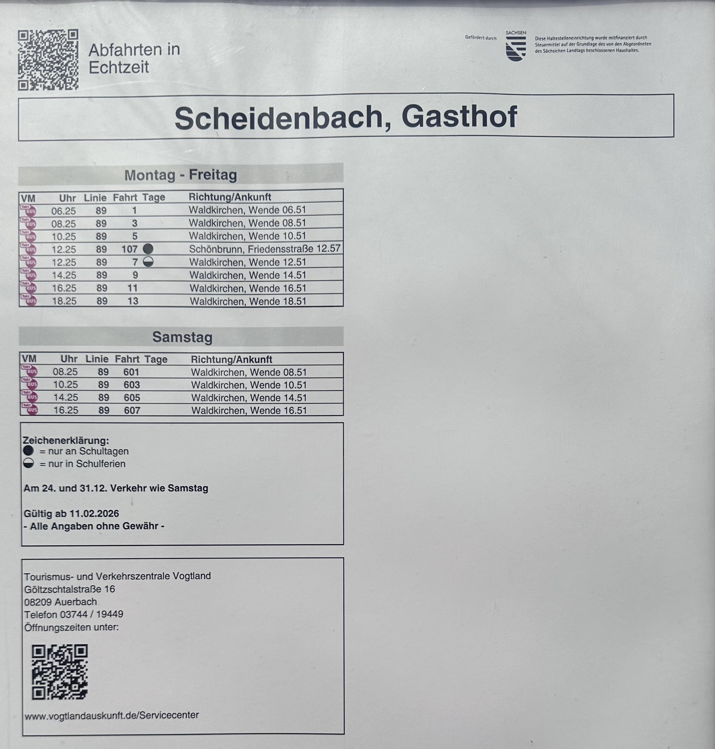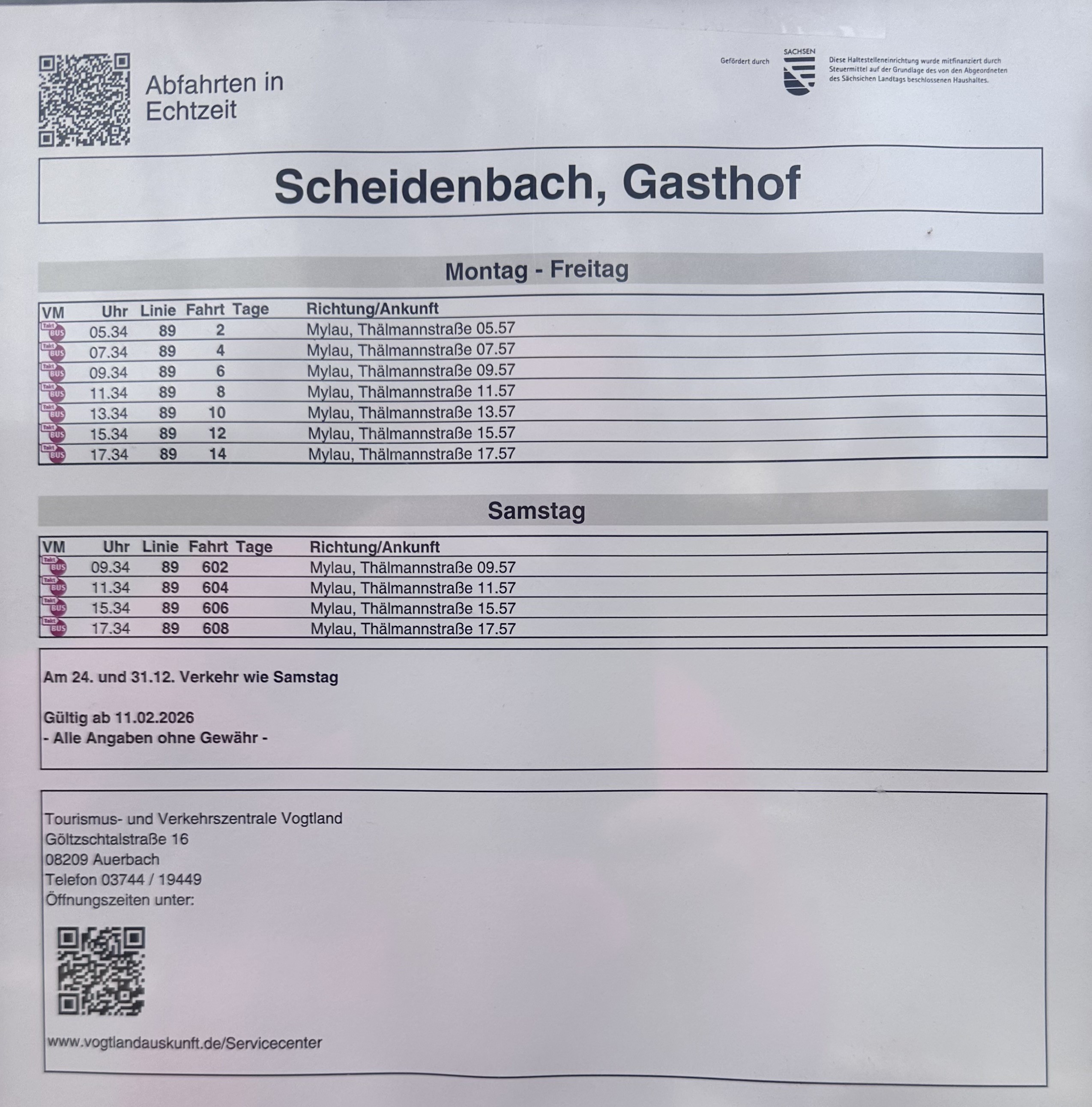 Fahrplan Linie 89 (Waldkirchen-Mylau über Lengenfeld-Weißensand-Schneidenbach-Reichenbach)